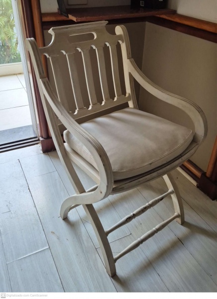 • Cadeira em madeira maciça pintada de bege medindo 90  cm de altura no encosto por 50 co por 55 cm não pode ser enviado pelos correios, retirada em local térreo em condominio na Av das Américas altura do Riviera del Fiori.