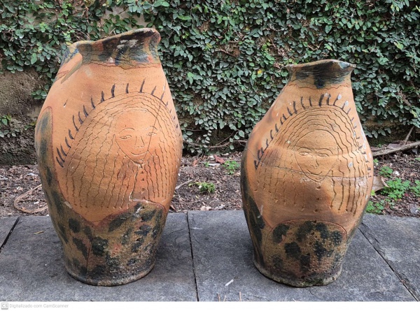 • Dois jarros  em barro cozido medindo 55 cm de altura por 38 cm por 32 cm e o outro 52 cm por 34 cm por 28 cm ambos necessitam restauro.