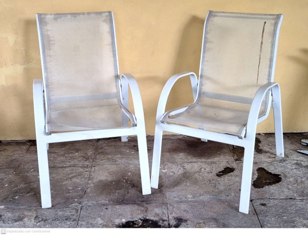 • Par de poltronas em aluminio com pintura eletrostática branca necessita troca da tela de nylon  medindo 110 cm de altura no encosto por 60 cm por 80 cm não pode ser enviado pelos correios, retirada em local térreo em condominio na Av das Américas altura do Riviera del Fiori.
