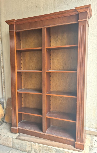 • Estante em madeira compensada revestido em mogno e encabeçado em madeira maciça medindo 197 cm de altura por 127 cm por 30 cm.
