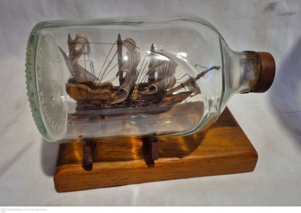 • Antiga montagem de caravela no interior de garrafa de Chivas medindo 17 cm por  cm de diâmetro.