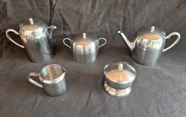 • Serviço para chá e café em aço inox composto de bule café medindo 15 cm de altura, bule para chá, leiteira e dois açucareiros sendo um para cubos.
