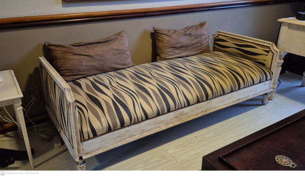 • Recamier em madeira maciça patinada revestida de tecido medindo 62 cm de altura por 190  cm por 80 cm,, retirada em local térreo em condominio na Av das Américas altura do Riviera del Fiori.