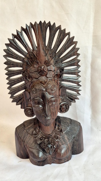 • Escultura em jacarandá representando divindade feminina medindo 27 cm de altura por 14 cm por 7 cm, perfeito estado de conservação.