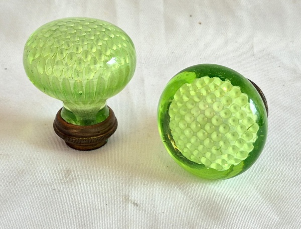 • Duas maçanetas Francesas ditas "Favo de mel" na cor Uralina com bases em metal medindo 5 cm de diâmetro por 5,5 cm de altura. Em perfeito estado.