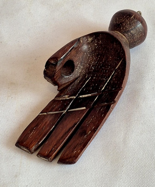 • Peça de balangandã em jacarandá medindo 10 cm de altura por 4,5 cm por 3 cm.