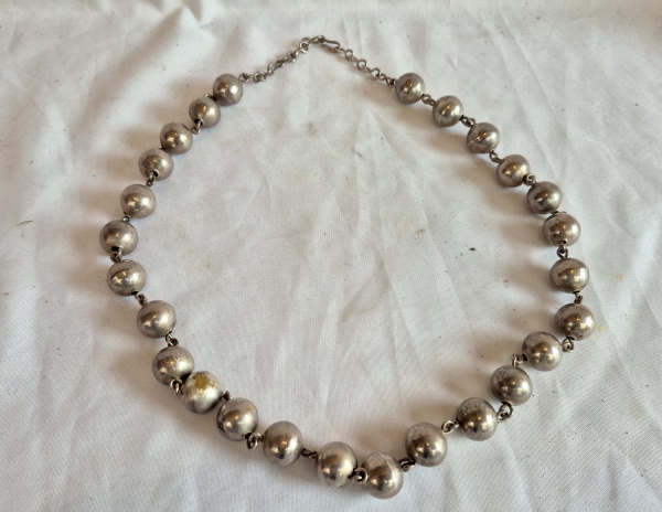 • Jóia de Crioula, colar de bolas em metal espessurado à prata com os elos do fecho em prata , medindo 86 cm de comprimento.