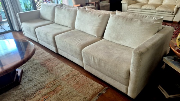 • Grande sofá em quatro módulos com duas almofadassoltas no encosto medindo 80 cm de altura no encosto por 345 cm em quatro módulos por 100 ce profundidade, apresenta desgastes em algumas partes no tecido da base visiveis nas fotos.