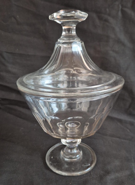 • Compoteira em cristal ao gosto Harcourt  medindo 21 cm de altura na pega por 15 cm de diâmetro. apresenta lascado emuma das arestas da pega..