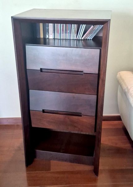 • Estante de apoio em madeira industrializada revestida em foleado com chanfrado na parte interior no tampo e nas laterais com quatro gavetas e dois vazados para colocação de objjetos, medindo 120 cm de altura por 60 cm por 45 cm.