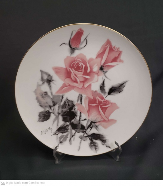 • Noritake, medalhão em fina porcelana Japonesa com pintura floral decorativa assinada pelo artista "J. Takeshi" medindo 26,5 cm de diâmetro, perfeito estado de conservação.