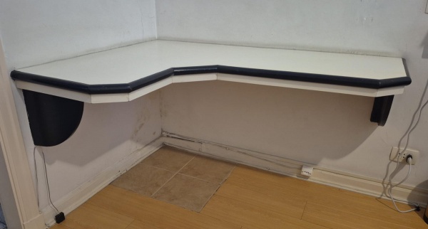 • Bancada de parede em compensado , fórmica e cabeços e cantoneiras pintadas de preto medindo junto a parede esquerda 107 cm a direita 140 cm por 50 cm de profundidade, apresenta sinais do tempo e minimo trincado na fórmica junto a parede, necessita ser retirada na rua J Carlos.