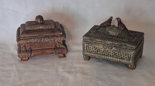 • Duas caixas para guardados em resina medindo 13 cm por 16 cm por 11 cm. Uma delas encimada por casal de pássaros e a outra com quebrado na tampa.