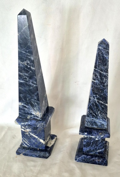 • Dois Prismas decorativos em Marmore Azul da Bahia o  maior com minima falta medindo 48 cm de altura por 11 cm por 11 cm e a outra com mais faltas medindo 42 cm de altura por 11 cm por 11 cm..