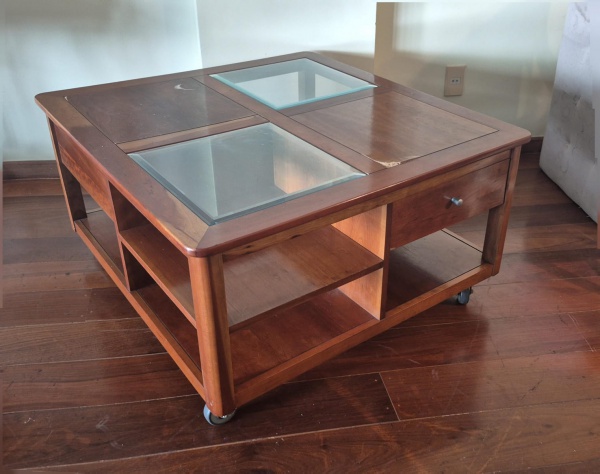 • Mesa de centro em madeira e aglomerado foleado com duas gavetas laterais