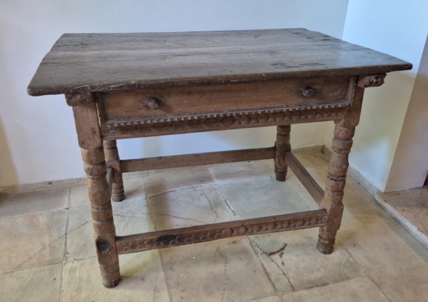 • Mesa de Apresentação século XVIII tampo maciço com patina do tempo gaveta central pernas torneadas com travas horizontais apresenta desgastes naturais de uso, medindo 86 cm de altura por 120 cm por 82 cm, deve ser desmontado e retirado por transportadora na Rua Piratininga - gávea RJ.