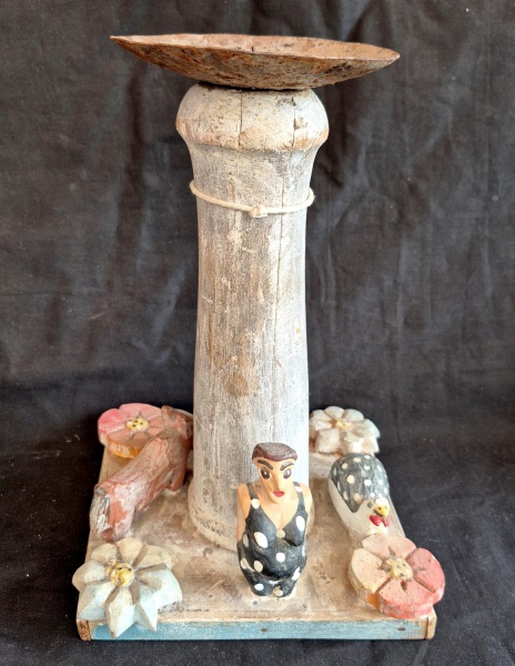 • Oficina de Agosto escultura em forma de castiçal base com elementos decorativos em madeira, coluna central torneada com bobeche em ferro e local para fixação de vela, medindo 32 cm de altura por 20 cm por 20 cm.