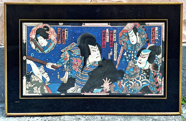 • Kunichika Toyohara (1835-1900) xilográfia japonesa sobre papel original do século XIX "Ukiyo-e"  cenas do teatro Kabuki,  emoldurada e envidraçada medida interna 35 cm por por 70 cm e total 52 cm por 88 cm  Renomado artista aluno de Kunisada Utagawa.