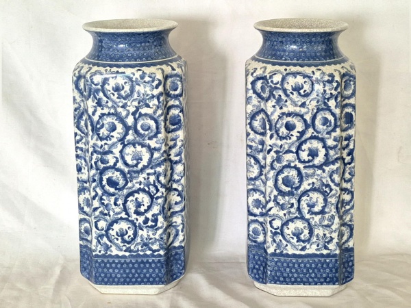 • Par de grandes jarros ao gosto oriental em porcelana vitrificada e craquele azul e branca  Medindo 46 cm de altura por 18 cm de frente por 18 cm, bom estado de conservação.