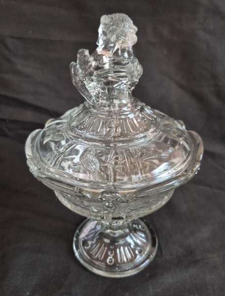 • Compoteira em vidrão com pega em forma de jovem com ave medindo 19 cm de altura na pega por 13 cm de diâmetro. bomestado de conservação.