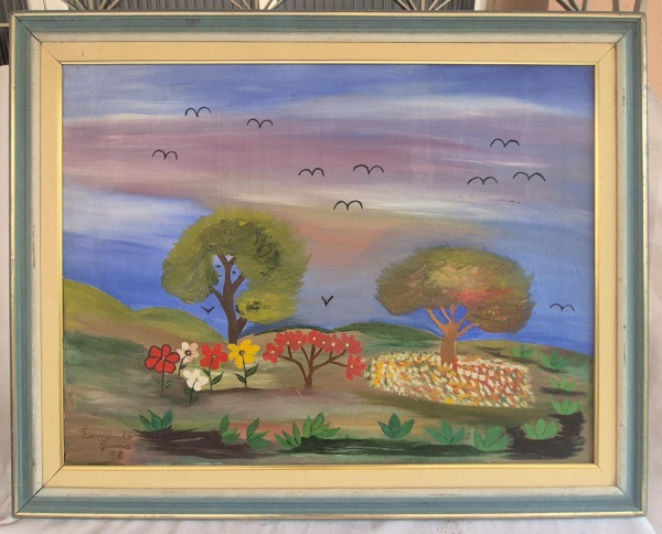 • Fernando Gama acrílico sobre tela datado de 1998 arte naife medida interna 60 cm por 81 cm e total de 75 cm por 95 cm.