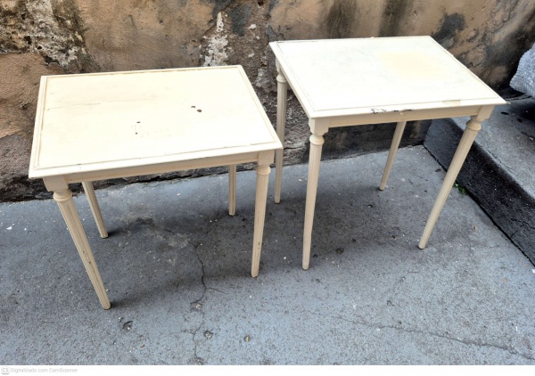 • Duas mesinhas de apoio ao gosto Império em madira compensada e maciça pintadas medindo a mais alta 56 cm por 48 cm por 33 cm, e a mais baixa 50 cm de altura, apresenta sinais de desgastes na pintura.
