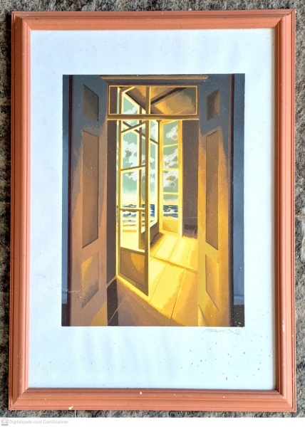 • Marcos Duprat serigrafia emoldurada medida interna 50 cm por 40 cm e total emoldurada e envidraçada 80 cm por 58 cm, "portal" assinatura não identificada datada de 90 e numerada 110/200, retirada em local térreo em condominio na Av das Américas altura do Riviera del Fiori.