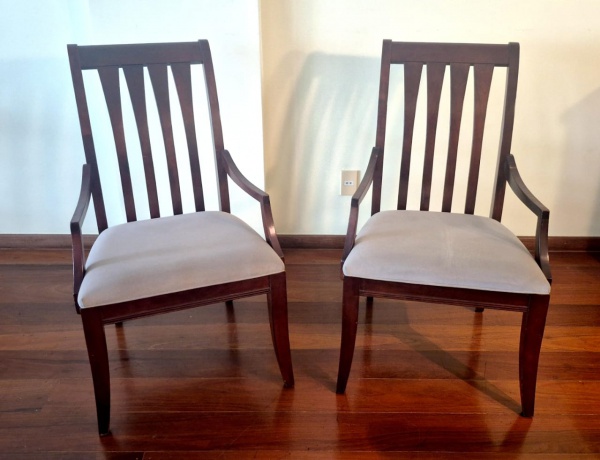 • Par de cadeiras em madeira nobre maciça com braços encosto ripado e assento estofado bom estado de conservação, medindo 101 cm de altura por 55 cmpor 55 cm.