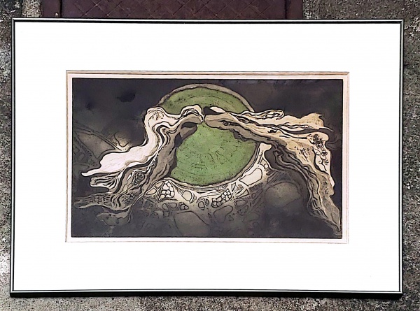 • Yvonne Cavalcanti - Isabel Pons, gravura em metal titulada "Encontro" numerada 8/30 assinada "Yvonne Canti" existem outros registros de gravuras da mesma chapa assinadas por Isabel Pons, este trabalho deve ter sido desenvolvido no período que as duas artistas lecionavam na cadeira de impressão na escola do parque Laje na gestão de Rubens Gerchman, medida interna  40 cm por 60 cm e total de 67 cm por 87 cm, apresenta minimos sinais do tempo e deve ser limpa.