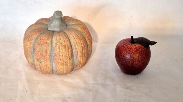 • Peça em porcelana em forma de abobora medindo 13 cm de altura por 15 cm de diâmetro, acompanha maça em resina medindo 8 cm por 7 cm .