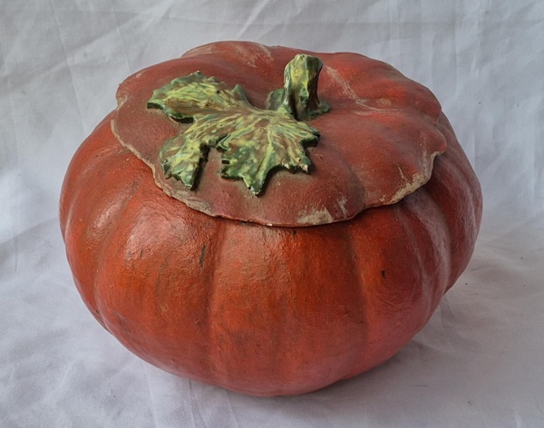 • Terrina com tampa em cerâmica no formato de abobora moranga , pega da tampaem folha esmaltada de verde 18 x 24 cm