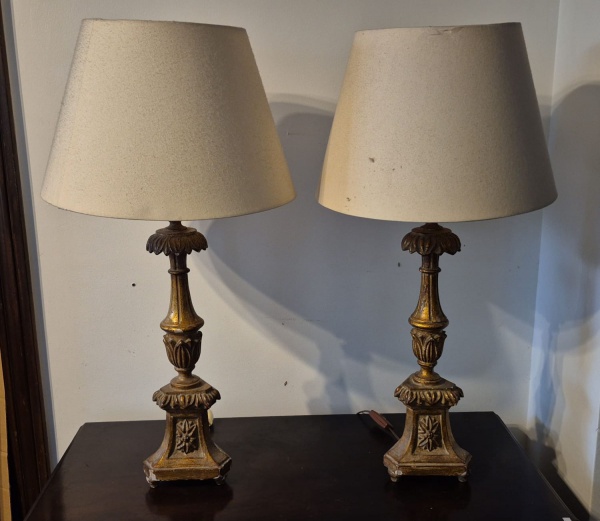 • Par de tocheiros em madeira maciça policromada e com vestigios de douração medindo 60 cm de altura por 15 cm por 15 cm no tacheiro.