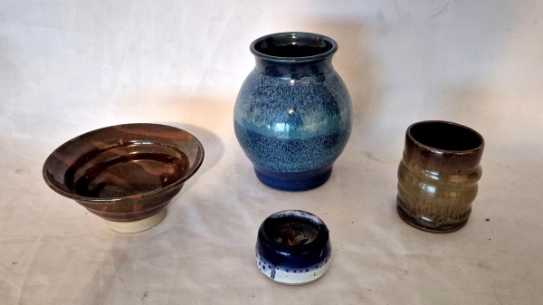 • Lucille Nutt ceramista Americana (Wallace, Idaho, em 1923, e faleceu em Apache Junction, Arizona, em 2016) tres peças em cerâmica vitrificada sendo vaso com 18 cm por 14 cm de diâmetro, bowl com 8 cm por 17 cm de diâmetro e copo co 10 cm por  cm diâmetro.