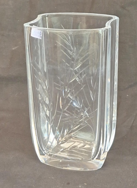 • Vaso em vidro moldado decorado com ramos de trigo medindo 17 cm por 9,5 cm por 9 cm, formato retangular.