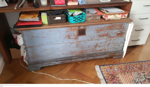 • Arca em vinhático Brasil século XIX caixa reta com policromia azul ferragens de época já substituída a fechadura medindo 60 cm de altura por 145 cm por 55 cm.