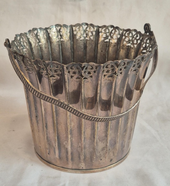• Balde de gelo em metal espessurado a prata "Meridional" borda com decoração em vazados medindo 27 cm de altura na alça por 15 cm de diâmetro.