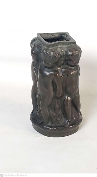 • Grupo escultórico em bronze em forma de vaso com perfil de crianças ao redor medindo 16 cm de altura por 12 cm de diâmetro.
