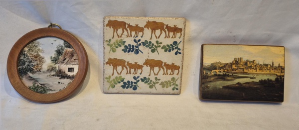 • Dois trabalhos sobre azulejo uma paisagem de Miriam Dutra  medida 14 cm de diametro e  placa com animais medindo  15 cm por 15 cm  e  reprodução 10 cm por 15 cm.