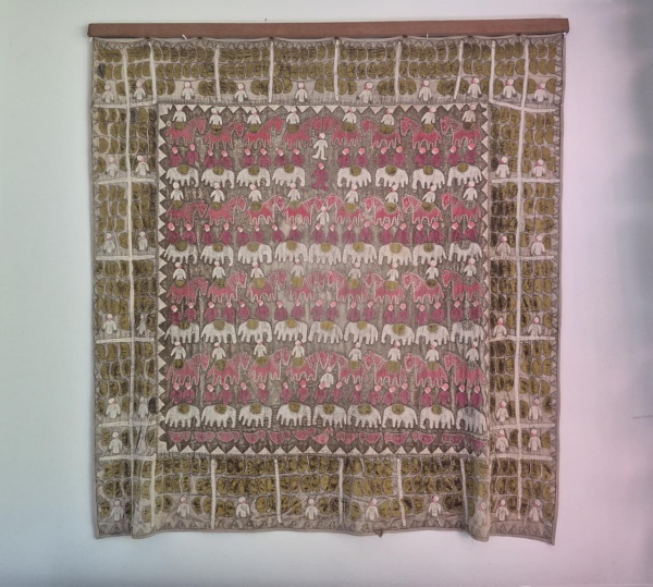 • Tapeçaria Indiana antiga com representações de figuras , elefantes e cavalos  medindo 122 cm por 122 cm, apresenta sinais de perdas de coloração devido a ação do tempo.